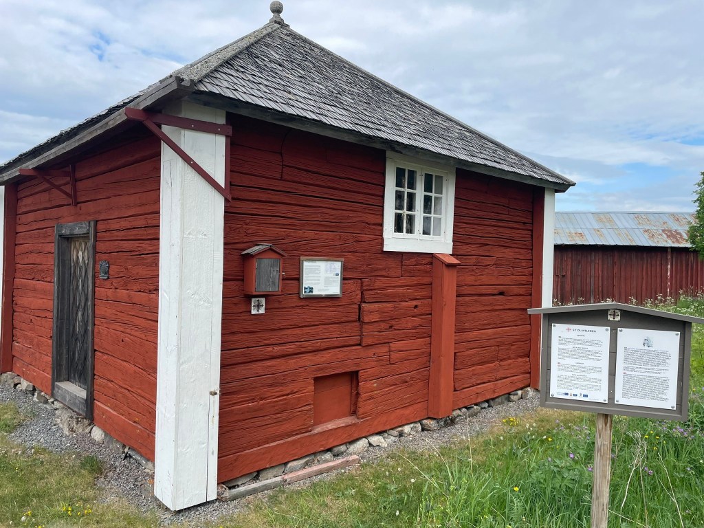 Daarna volgt een middaglange wandeling door het bos, naaldbomen en berken met kruidenondergroei, alles ziet er groen en fris uit. Na een sanitaire stop, besluit ik alleen en in mijn tempo door te lopen. Mijn slaapplaats is een aantal kilometers verder dan waar My gaat slapen. Na ca. 7 kilometer door het bos kom ik bij het tweede kerkje van vandaag, in Näskott.