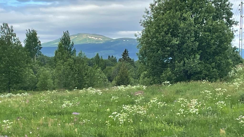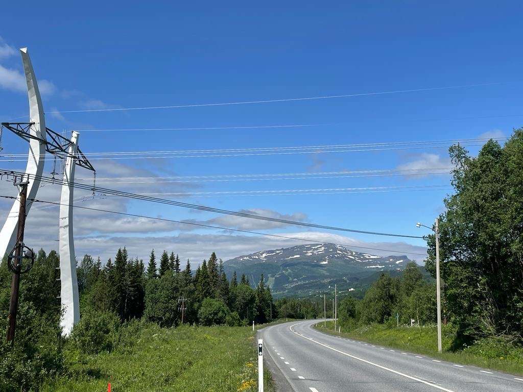Als ik weer op de autoweg loop, merk ik dat de besneeuwde berg dichterbij is gekomen. (Later blijkt dat mijn bestemming van vandaag te zijn, Åre, dat aan de voet van die berg ligt).