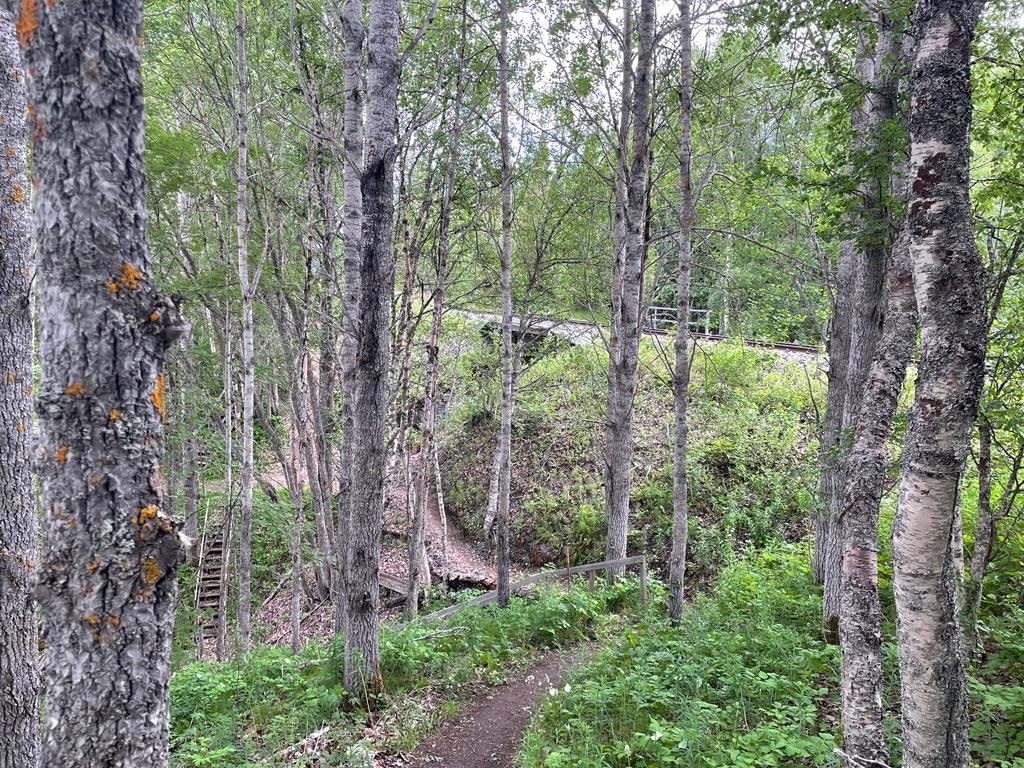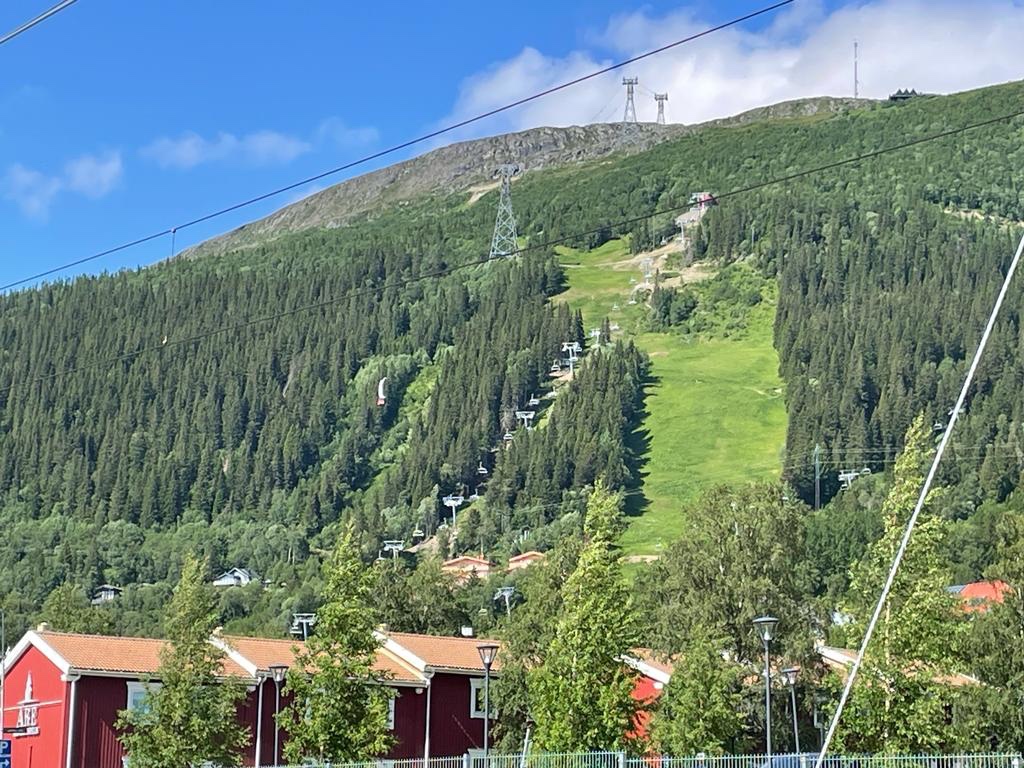 Langs het spoor loop ik Åre binnen. Rechts zie ik een grote berghelling met een kabelbaan (dichte cabines) in werking.