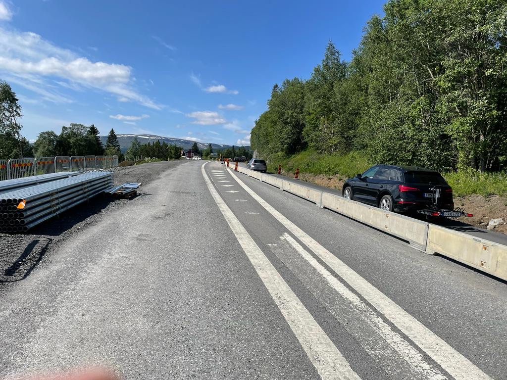 Nog een uurtje lopen langs het Olavspad voor fietsers. De asfaltweg is in reparatie, zodat de helft gesloten is en het verkeer om beurten gebruik mag maken van die andere rijbaan. De gesloten baan is voor mij alleen.