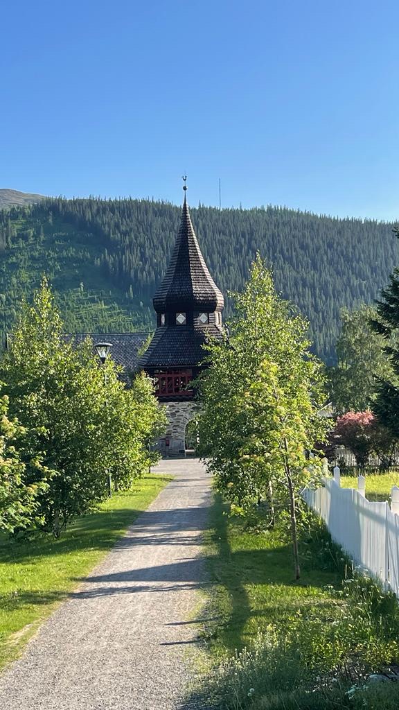 Dit mooie kerkje – 11 x 5 m – is gebouwd in de 12e eeuw, volgens Noors ontwerp, gewijd aan Olav en ook gericht op passerende pelgrims. De klokkentoren is later gebouwd in de 18e eeuw. Ik schrijf nog een bedankt in het gastenboek.