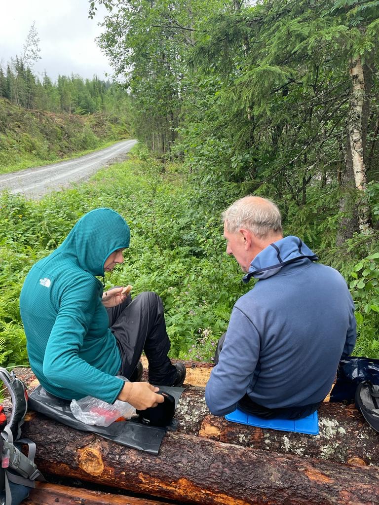 Het wordt steeds langer droog en het is tijd voor de lunch. Een stapel boomstammen als droge zitplaats is erg geschikt.