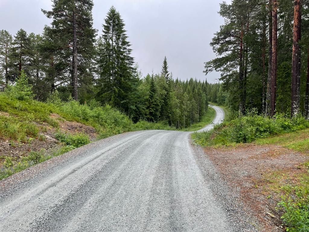 De weg is verhard met grind en is door de regen af en toe glibberig. Na een flauwe bocht staat er op grote afstand een hert naar me te kijken, twee reebruine ogen. Deze keer lukt de foto.
