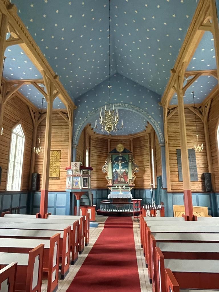 Het interieur heeft iets van een sprookje, liefdevol en magisch, met aan het plafond een sterrenhemel. Tegelijkertijd schijnt het zonlicht naar binnen. De houten wanden en het houtsnijwerk zijn oud, maar er is ook veel vernieuwd. Het vraagt veel onderhoud.