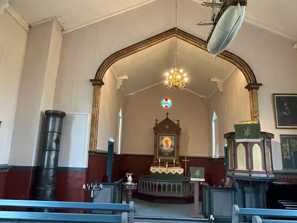 Het kerkje is weer een pareltje, heel sober, met wat houtsnijwerk, een paar simpele schilderijtjes aan de muur en behalve kerkbanken, een preekstoel en een orgel achterin is het vrij leeg. Geen poespas.