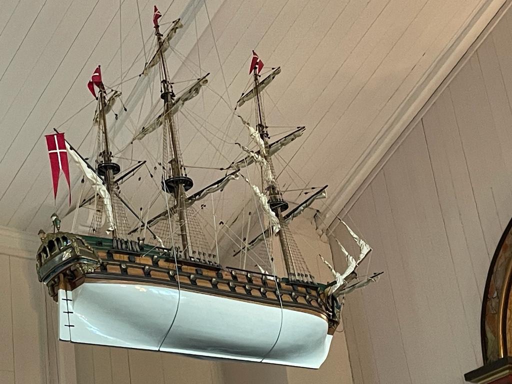 Aan het plafond hangt een lamp in de vorm van een boot met zeilmasten. De meeste Noorse kerken hebben een soortgelijke lamp als symbool voor ‘veilig in Jezus’ armen op de gevaarlijke zee van het leven’.
