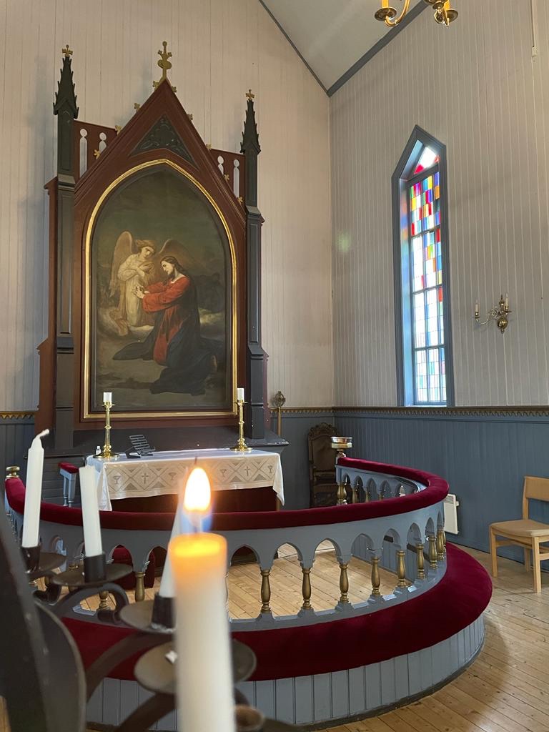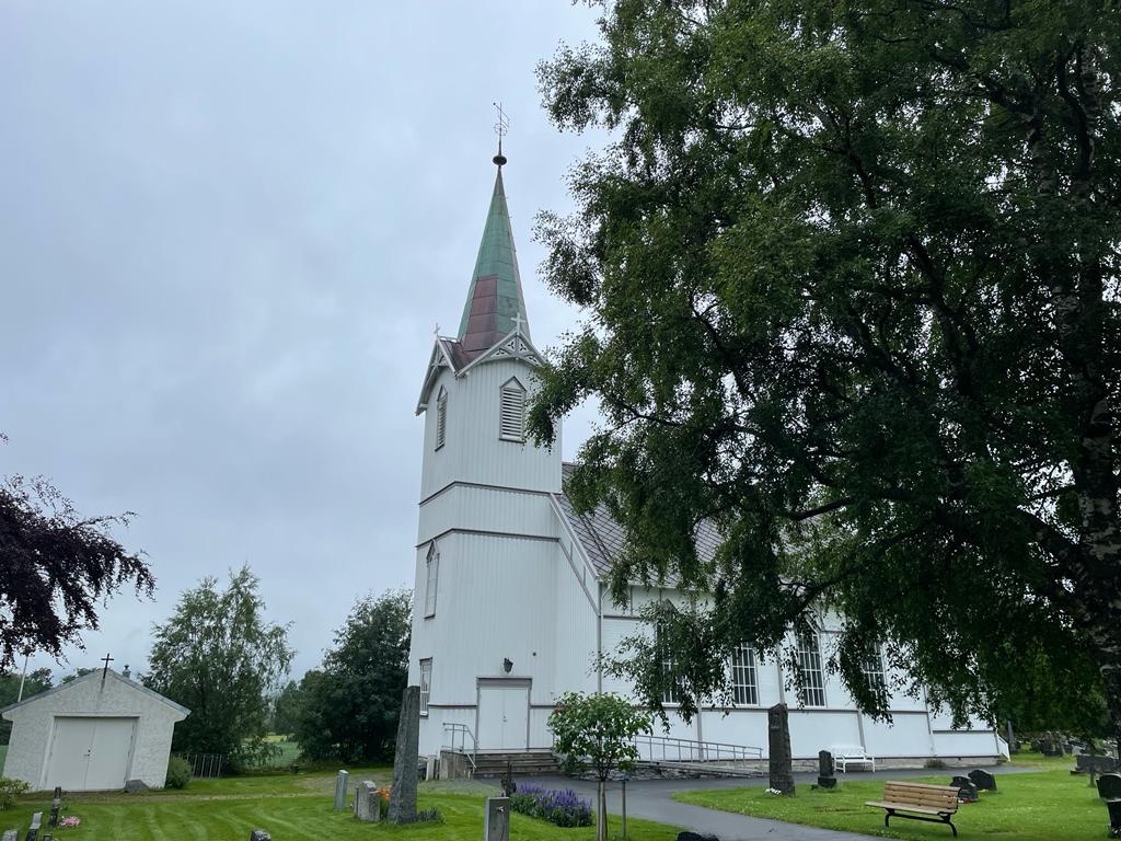 Ik hoor af en tot een vliegtuig, zien is moeilijker door de lage wolken: het vliegveld van Trondheim moet in de buurt zijn. Na een energiereep vertrek ik weer en kom dan aan bij het kerkje van Lånke.