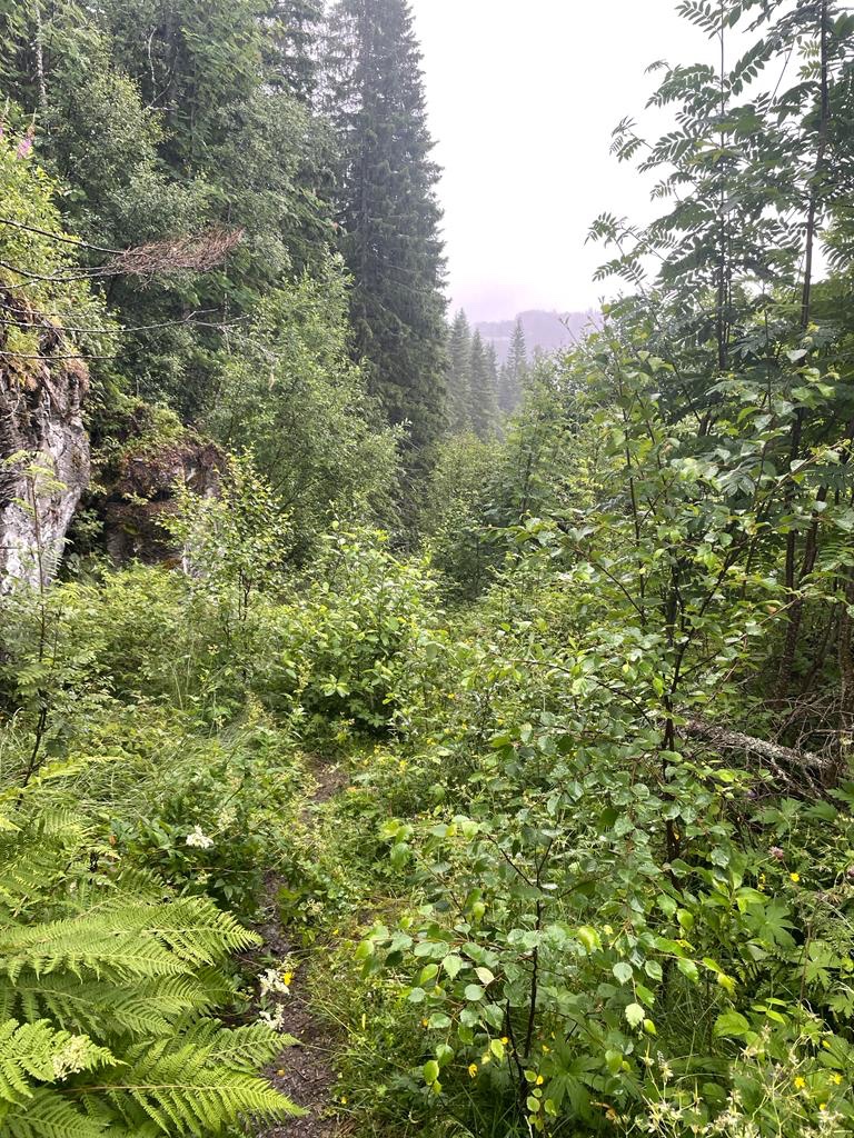 Maar dat gaat dus mis want ik kom in een bos waar het paadje steeds langer en ook smaller wordt. Ik krijg weer van alle kanten natte planten tegen mijn lijf.
