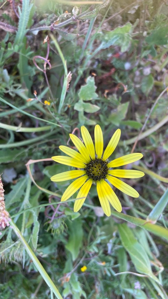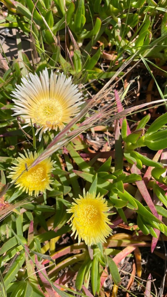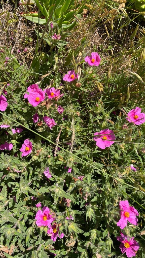 Het is een rustige wandeling zonder het geluid van de golfslag en vrijwel windstil. Overal veel bloemen.