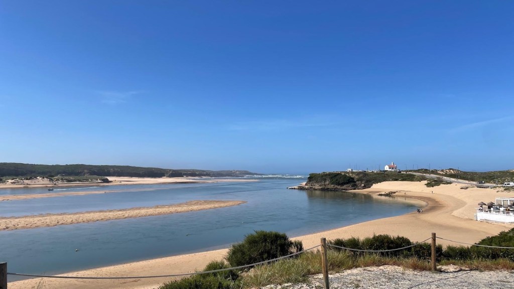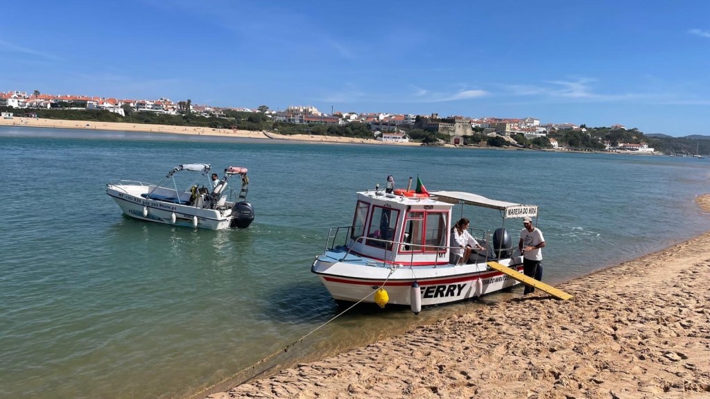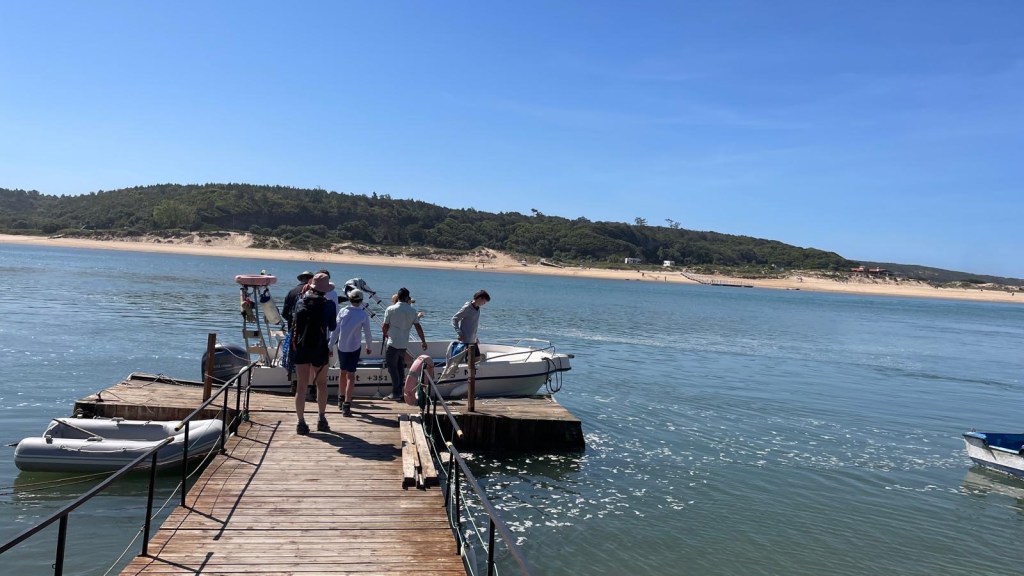 Het plan is om de baai heen te lopen, landinwaarts, dan de brug te nemen en aan de overkant weer naar de oceaankust te wandelen. Maar … onderweg spreekt een Portugese ons aan en kunnen we voor 5€ p.p. meteen aanschuiven bij een Nederlands gezin in een speedbootje naar de overkant.