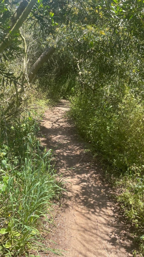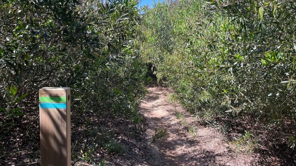 Een groot deel van de wandeling volgen we smalle paadjes in de struiken die soms zo dicht tegen elkaar staan dat je – met rugzak – moet bukken, kruipen en over ondergroei moet heen stappen. Links en rechts voel je de planten langs je lijf gaan. Op je kop schijnt de zon, tussen de struiken is het heet.