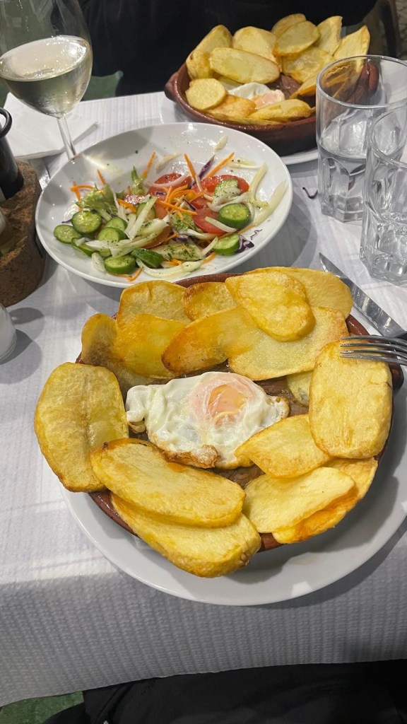De zon schijnt al sterk en reflecteert tegen de witte kalkmuren met blauw om de ramen. Koffie met sinaasappelsap en geroosterd brood met jam. Smaakt heerlijk, niet duur. En gezellig gekletst met een Schots stel, die ons enthousiast maakte voor een wandeling in hun highlands.