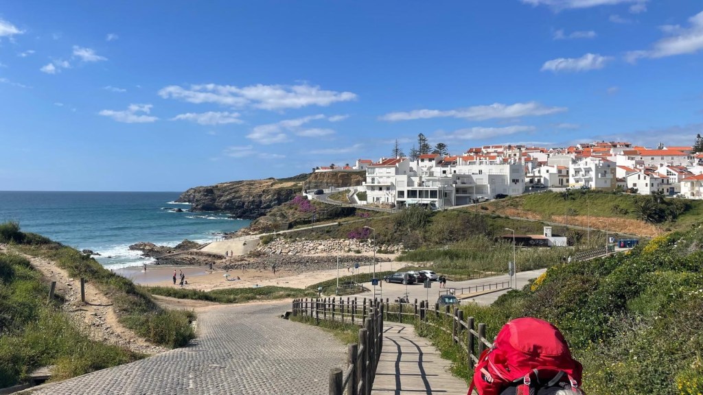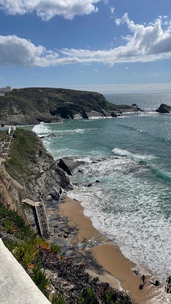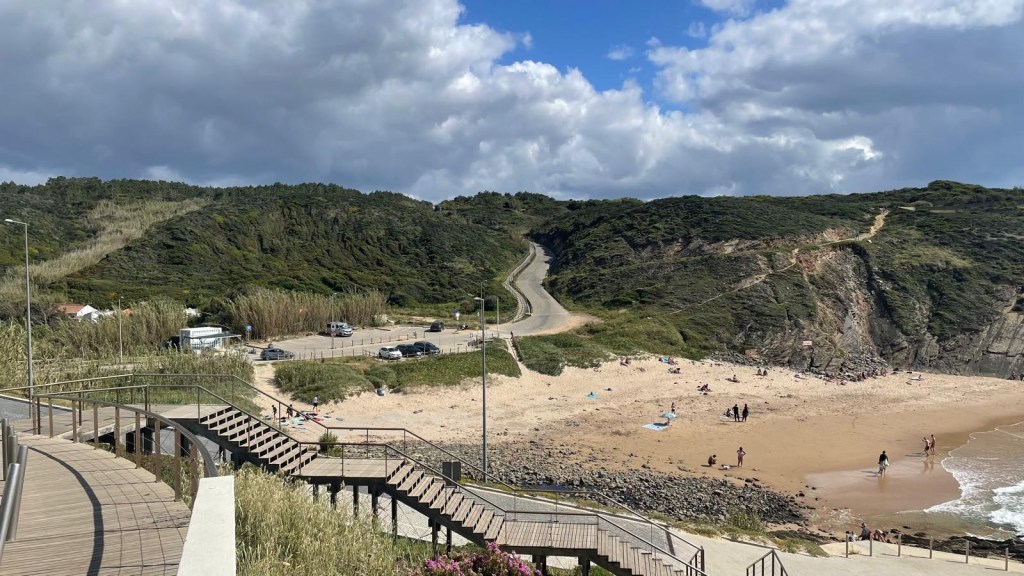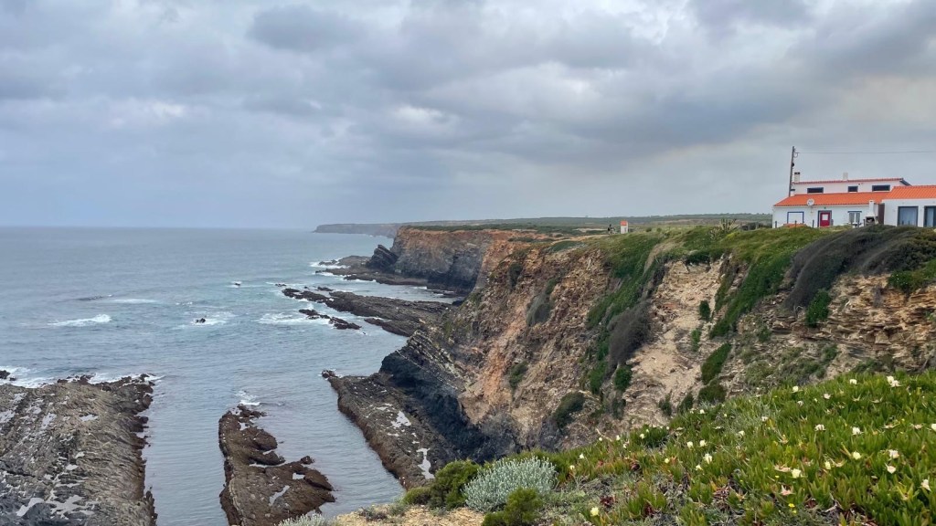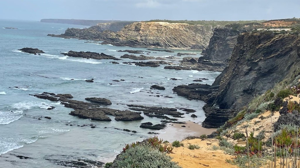 Na een prachtige Indische kers in bloei slaan we vlak voor het stadje Zambujeira do Mar af naar de kust waar we terecht komen op zandpaden tussen het lage begroeisel.
