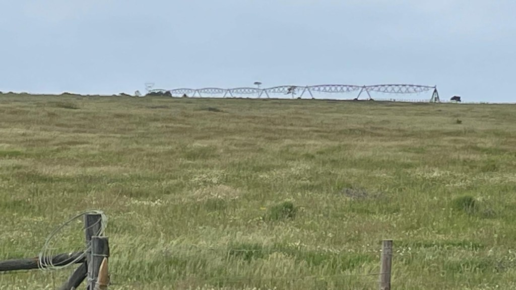 We lopen in zuidwestelijke richting naar de kust en komen langs de landbouwvelden. Aan de horizon zie ik enorme rijdende sproei- installaties staan die in een grote cirkel de grond kunnen irrigeren.
