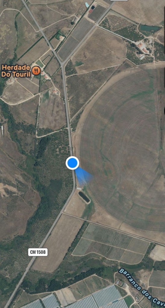 Op de satellietfoto’s kun je goed zien hoe groot die ‘sproeicirkels’ kunnen zijn. Het blauwe puntje: daar loop ik, aan de rand van de cirkel.