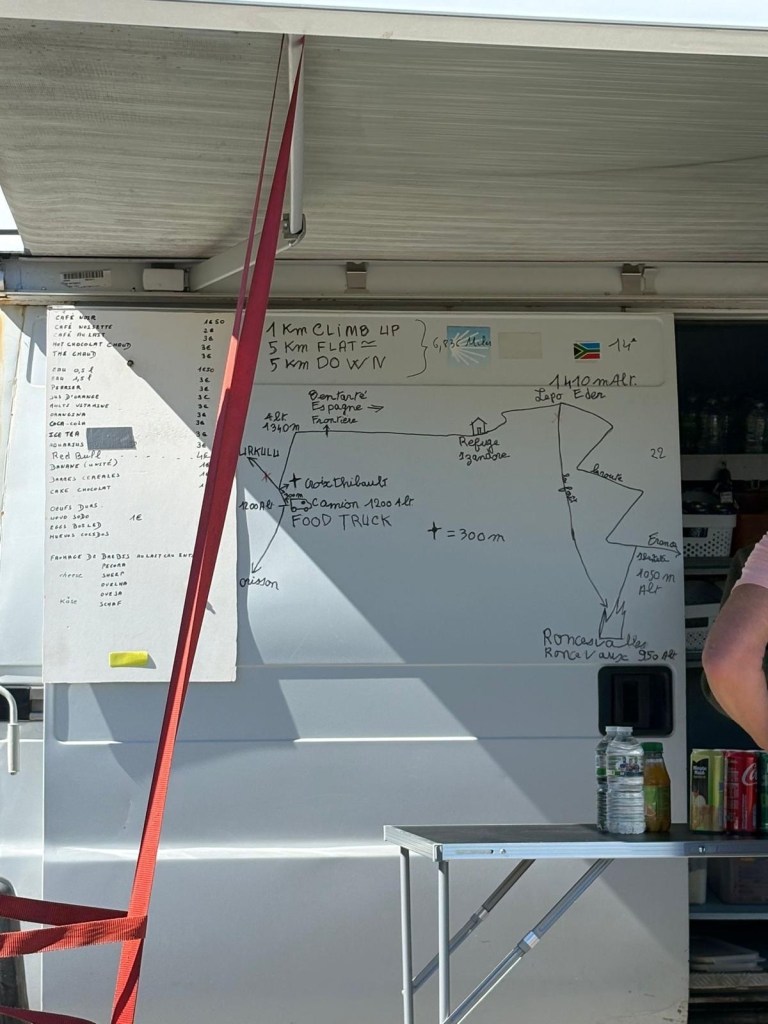 Daarna door tot we bij een camper een blikje cola drinken. Daar zien we een kaart met de resterende afstanden: nog 1 km stijgen, dan 5 km vlak en dan 5 km dalen.