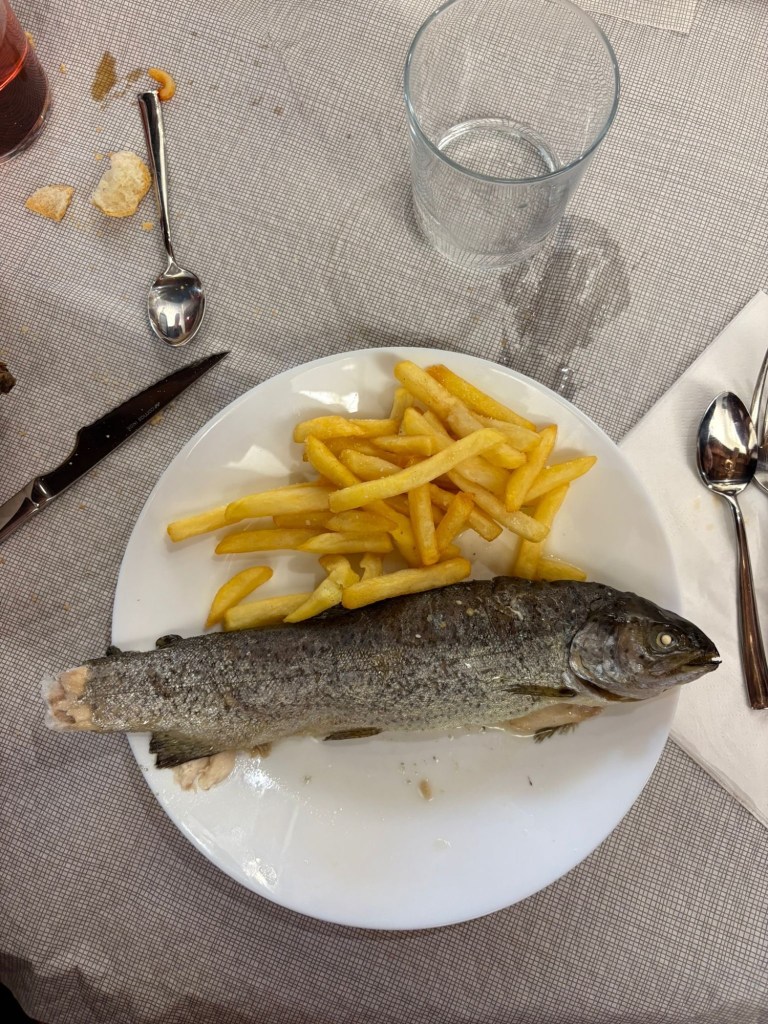 Heerlijk gevoel van een beetje thuiskomen, rustpauze op bed, douche en met Jos wat drinken op het terras. Voor het avondeten zaten we aan grote tafels met 10 personen te smullen van soep, pasta, kip of vis.