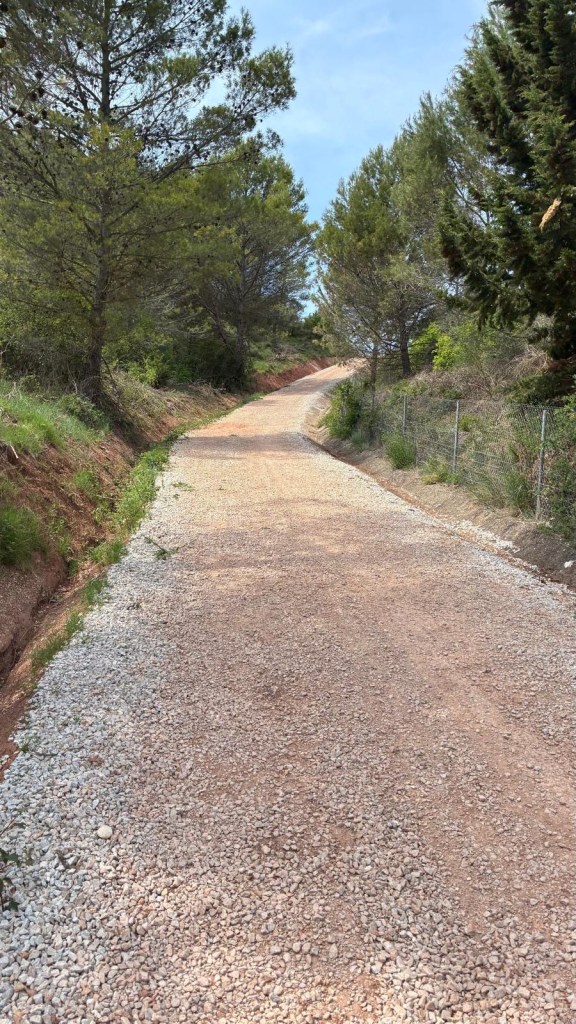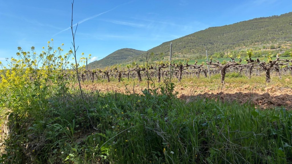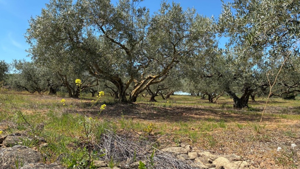 Glooiend groen met slingerende paadjes, wijngaarden die nog weinig laten zien en olijfbomenvelden.