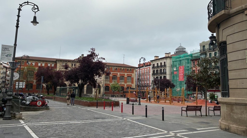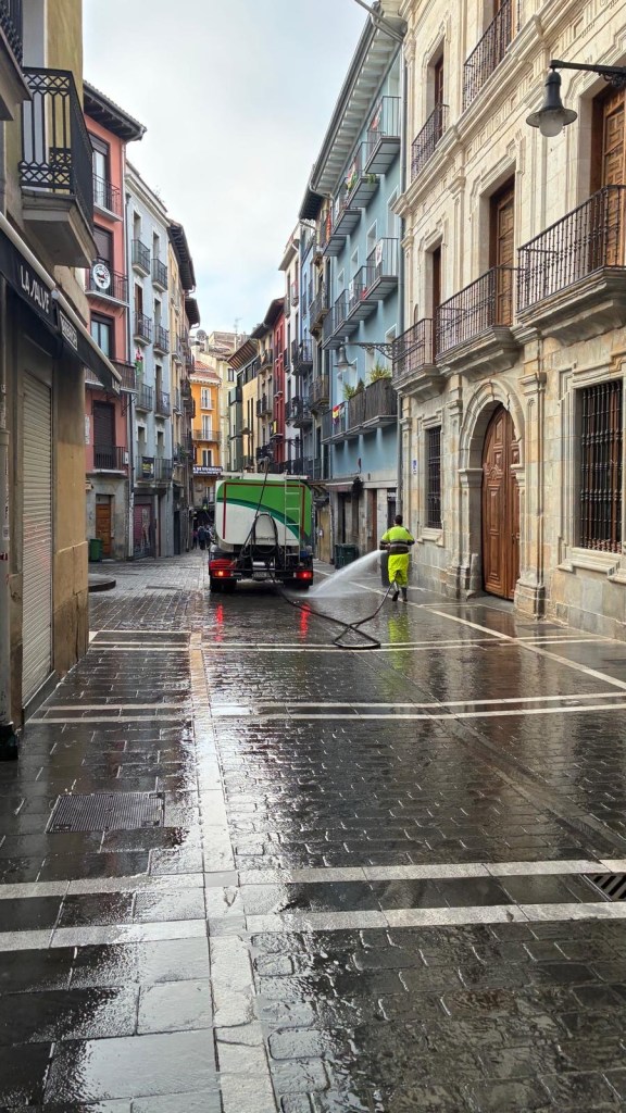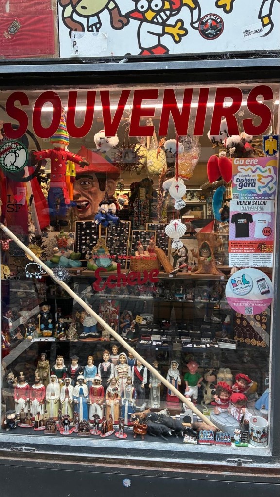 Ik vind Pamplona een mooie en gezellige stad, pleinen met speeltuinen en terrassen, verrassende etalages, bloemen aan balkons, veel kinderen en ook wankele oudjes die op bankjes in de zon zitten te genieten. Nu is het nog stil en zitten de vroege vogels in de kroeg met koffie en croissant te lezen in de krant die, geklemd aan een stok, gratis te vinden is.
