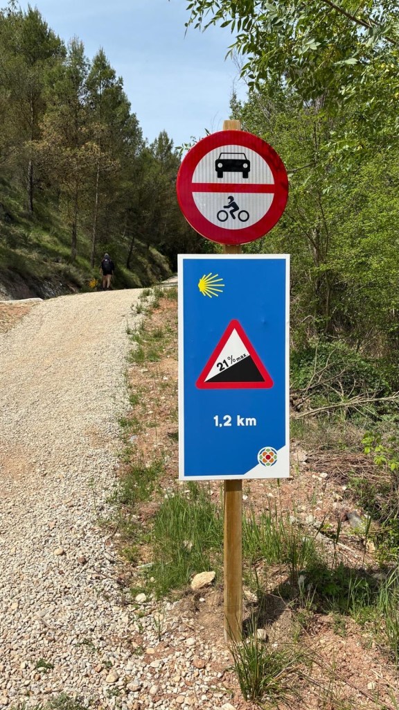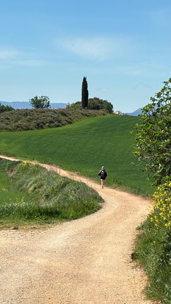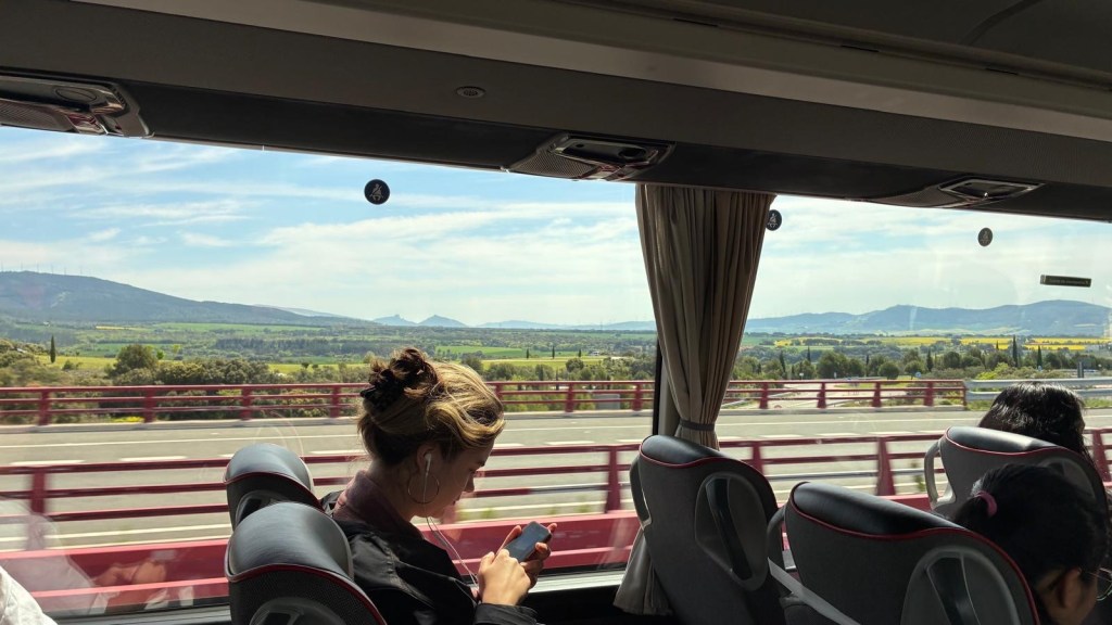 Voor vandaag was het plan om 35 km te lopen. Dat gaat Sofie niet lukken, pijn aan voeten en scheenbeen, dus we gaan het grootste stuk met de bus doen en daarna lopen naar de gereserveerde slaapplaats in Cirauqui. We missen wel de berg met de beroemde roestige beelden van de pelgrims. Het zij zo.