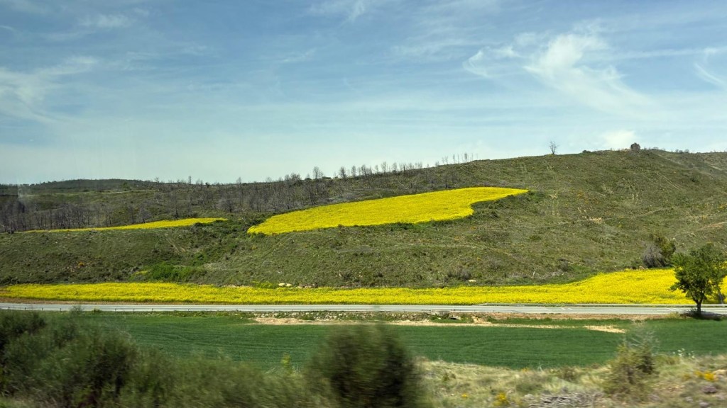 Ik heb het gevoel dat we nu langzaam de Pyreneeën verlaten en dat de natuur wat vriendelijker wordt. Meidoornstruiken, bloeiend koolzaad.
