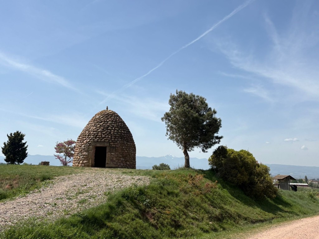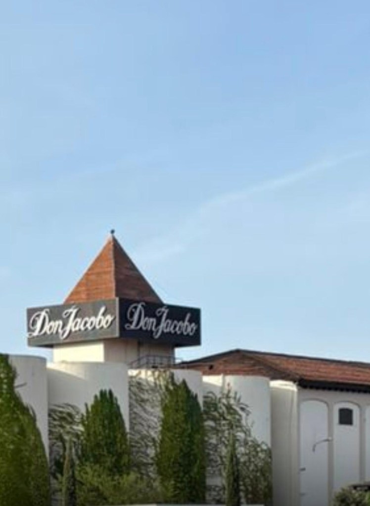 Even verderop komen we langs de ruïnes van een pelgrimshospitaal met daarachter een groot reclamebord van de riojawijn Don Jacobo.