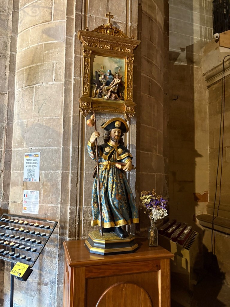 Gezellig met andere pelgrims die ons tippen in de kerk te kijken naar al het mooie. Maar het licht is uit, op enkele plekjes brandt licht. Zo kan ik toch een pelgrimsbeeldje zien in de kerk.