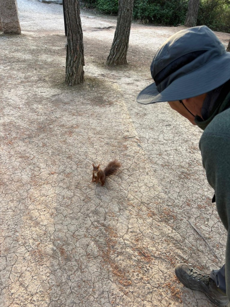 We moeten nog een flink eind lopen voordat we eindelijk de stad verlaten. Al snel komen we bij een enorm stuwmeer, eromheen lopen we door een bos van dennenbomen die me doen denken aan de IJzeren Man in Vught. Dan komt er plots een eekhoorntje op me af en begint om me heen te huppelen. Heel tam is ie en niet bang.