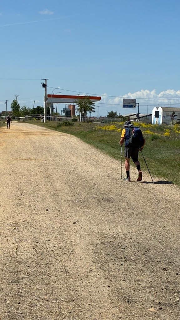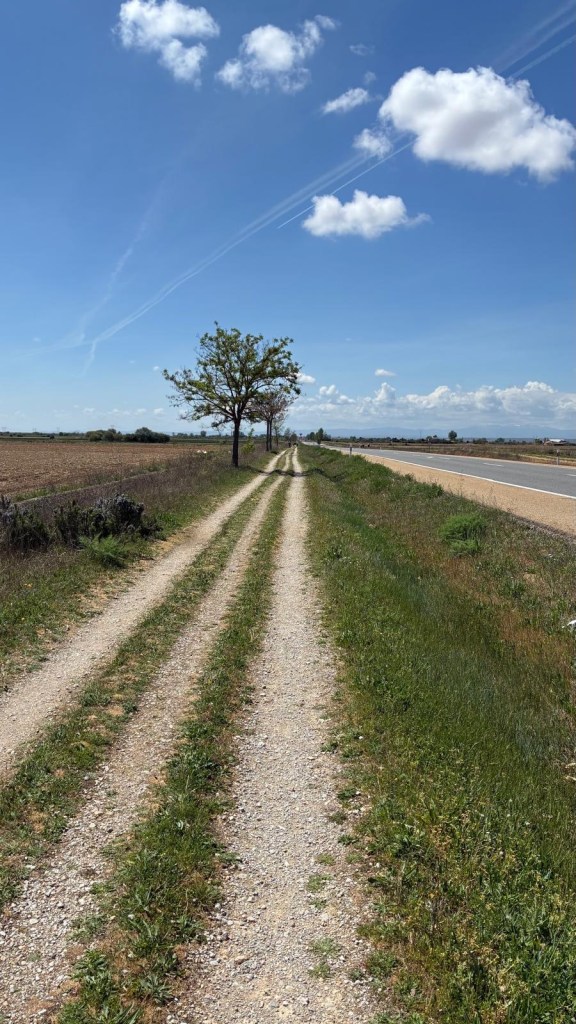Soms wat bredere paden langs de autowegen met daarop ook een pelgrim die krom blijft lopen nadat hij zijn rugzak heeft afgezet.