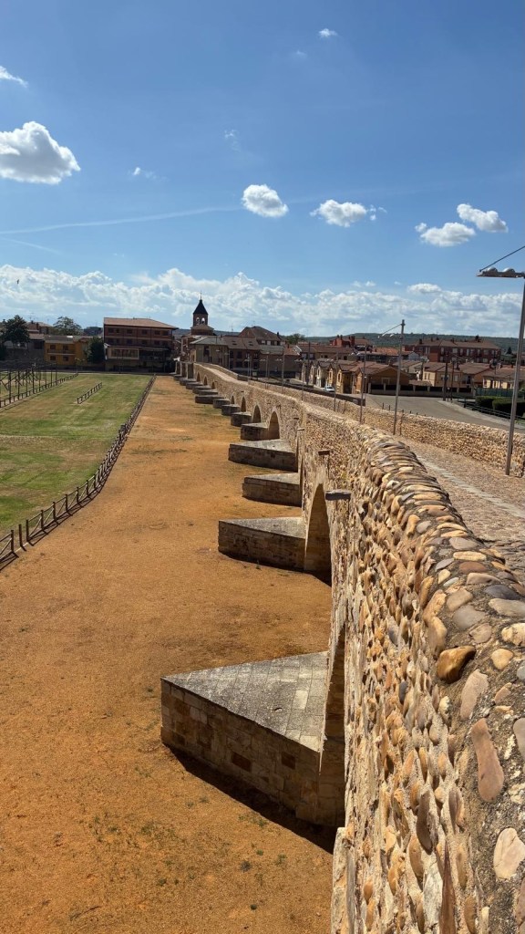 Dan eindelijk, we hebben er dan zo’n 30 km opzitten, buigt de weg naar rechts. Sofie is al een half uur eerder aangekomen op de bestemming. Wat is ze sterk! Ik nader het stadje en zie de prachtige Romeinse brug over de Órbigo.