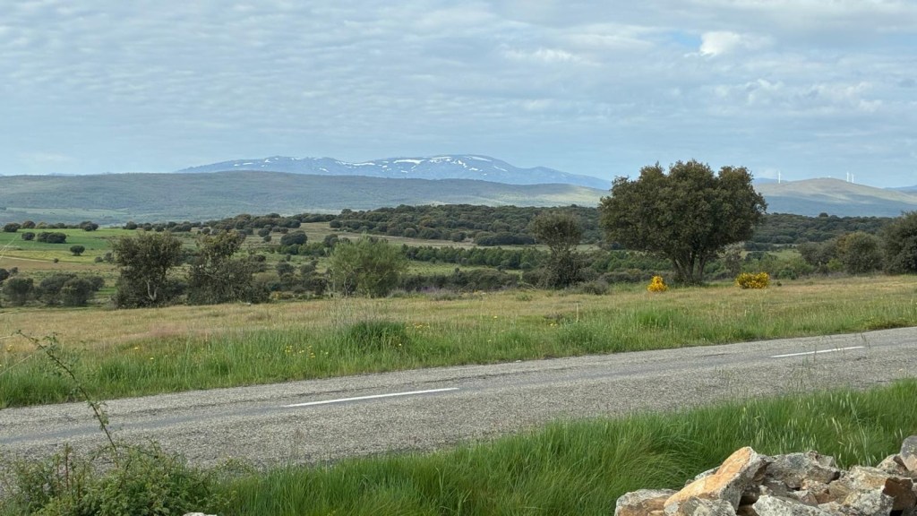 De laatste 10 kilometers stijgen we verder over de lange rechte grindpaden langs de autoweg. Soms zien we de besneeuwde toppen van de Picos de Europa.