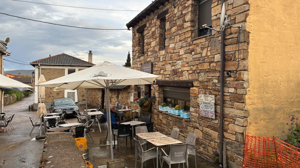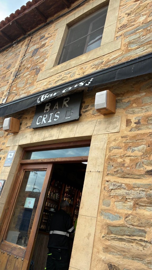 In het eerste dorp ontbijten we. Een enorme chaos in een te klein cafeetje. Een grote man die koffie met melk maakt, brood roostert, alles inschenkt en klaarzet en afrekent. In dat kleine kamertje komen naast pelgrims, enkele lokale bouwvakkkers, ook 2 van Guardia Civil en twee van de Policia Nacional binnen die prompt binnen zitplaatsen krijgen aangeboden. Ik ben blij als ik met de afgerekende ontbijten weer buiten sta: Bar Cris(is)
