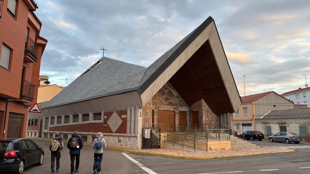 Het ziet er bewolkt uit als we de herberg verlaten. Er wordt regen verwacht en het is een beetje fris. Een lange tocht weer door de straten van de stad; ook eens een moderne kerk in één nieuwbouwwijk.